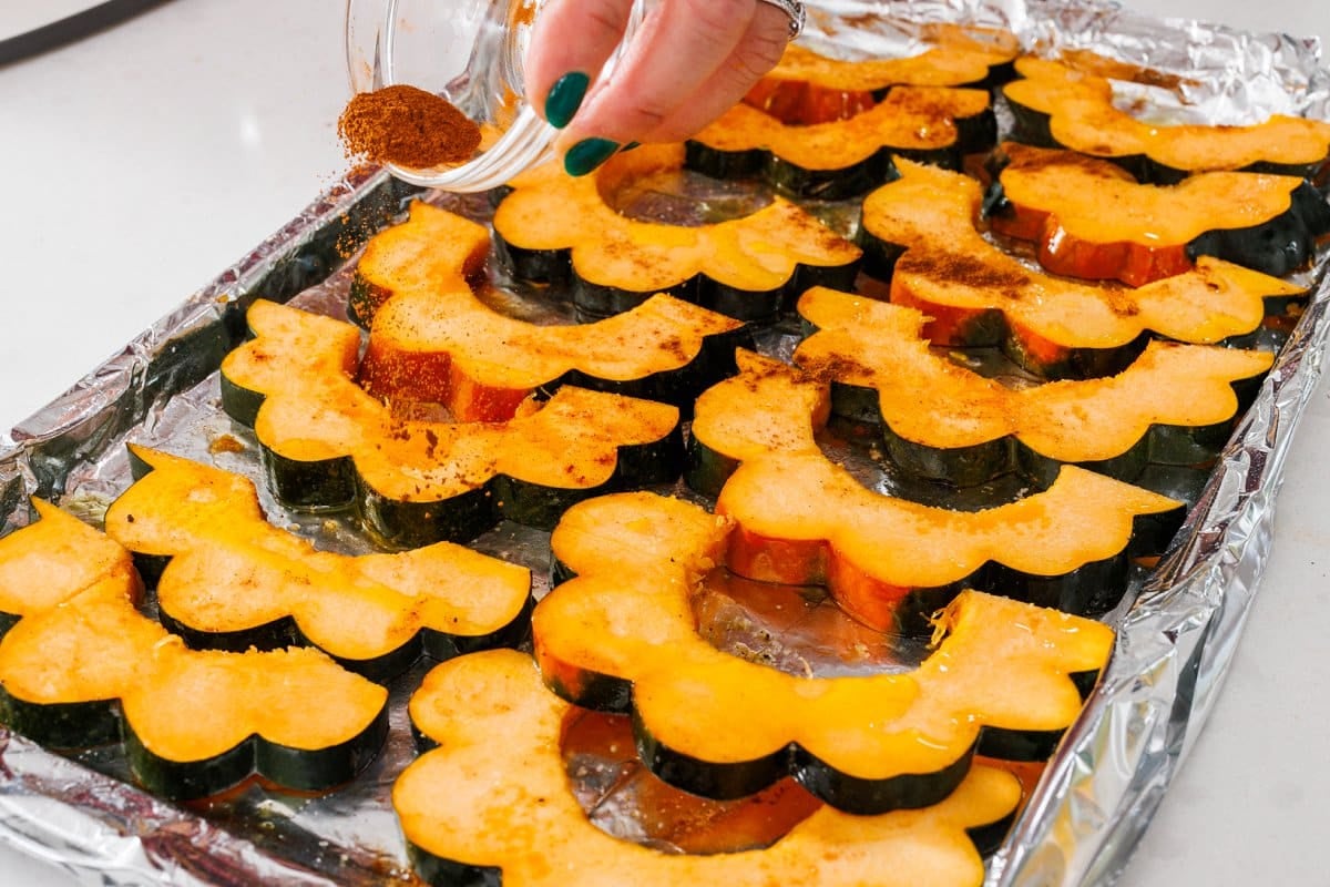 - Drizzle the squash slices with olive oil and toss to coat on both sides. Sprinkle with cinnamon, half of the salt (1/2 teaspoon) and pepper then toss again. Bake until golden brown and tender, about 25-30 minutes.
