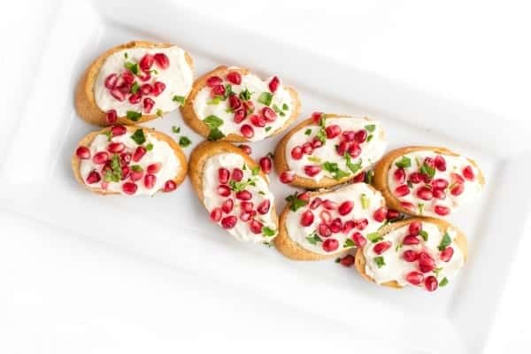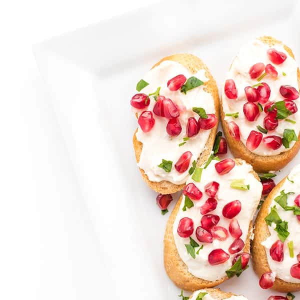 - To serve, spread each crostini with whipped feta and sprinkle with pomegranate seeds and minced parsley.