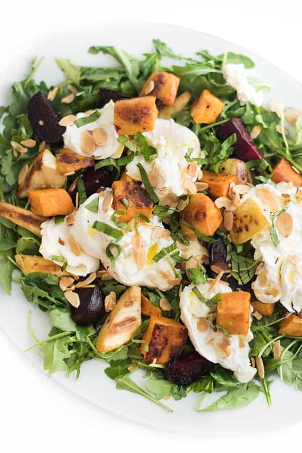 This hearty, roasted root vegetable salad recipe is made creamy burrata cheese, spicy arugula, and crunchy toasted almonds.