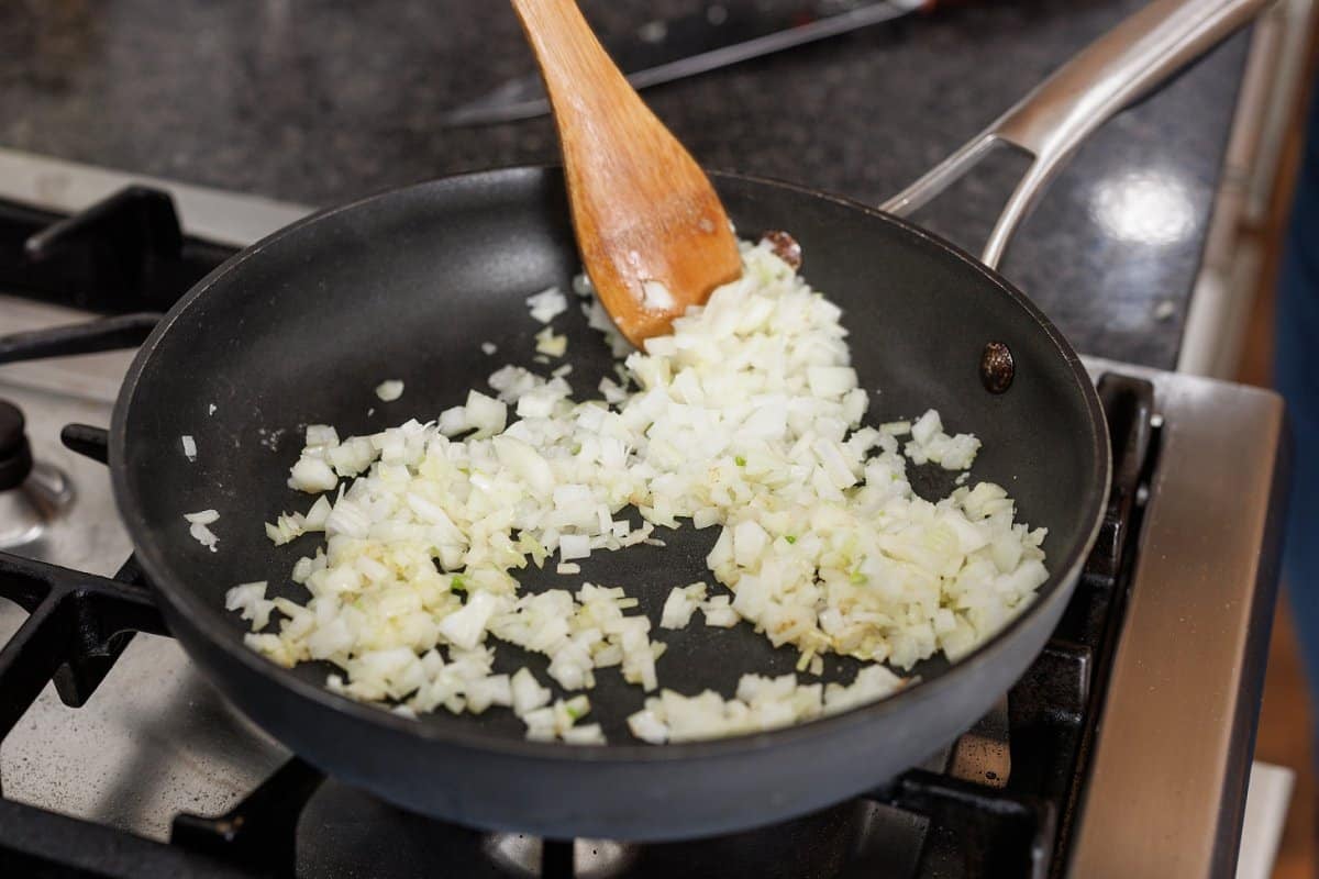 Then in a pan over medium-high heat, sauté your onion with a pinch of salt and pepper.