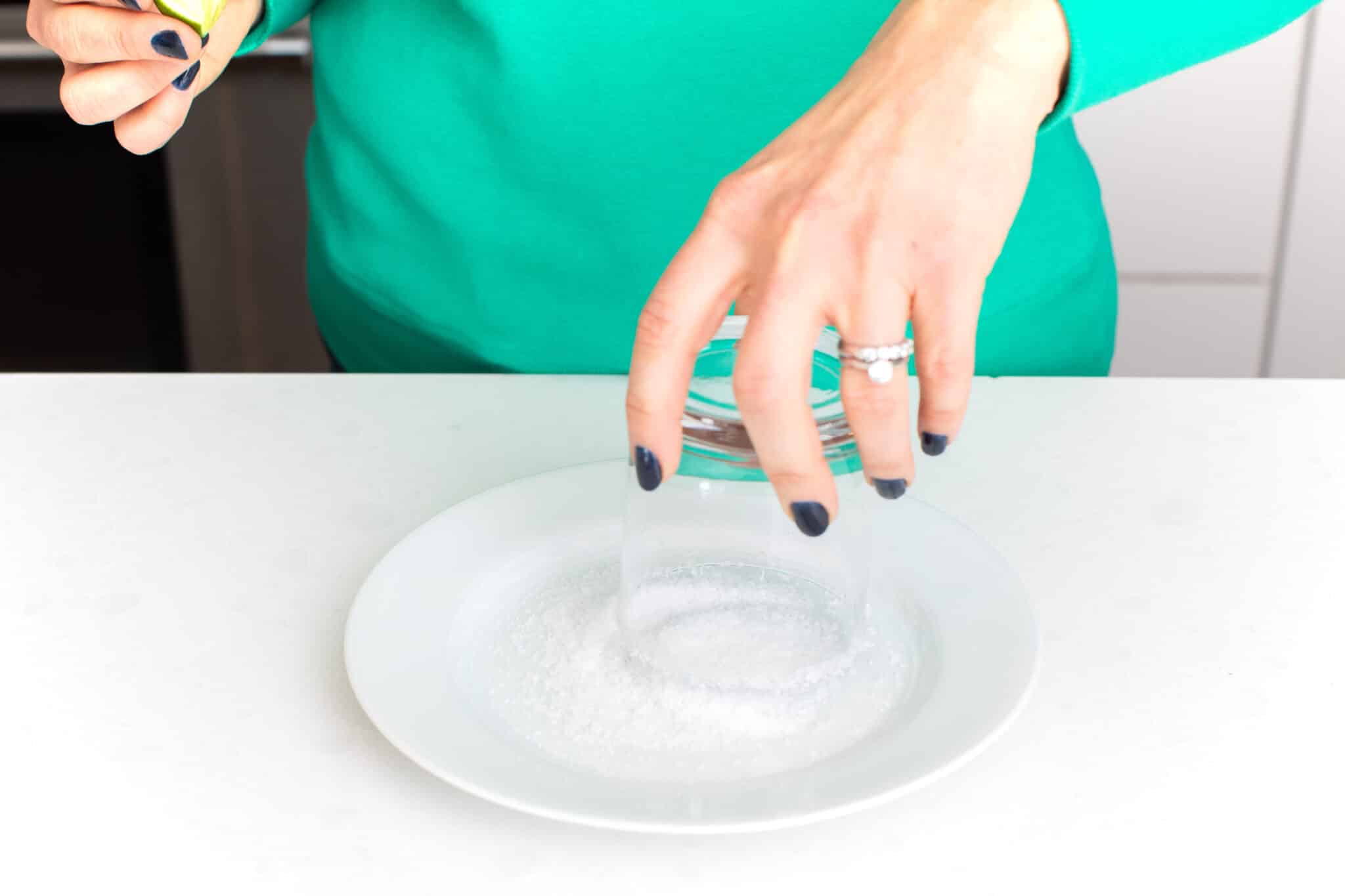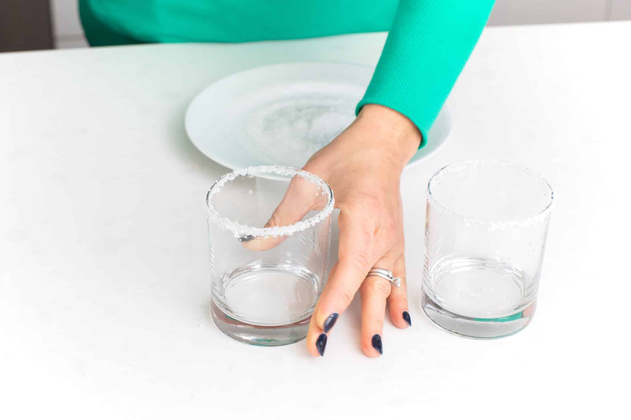 - Rim the glasses with salt by rubbing eat glass with a lime wedge. Place salt on a small plate then rub the glass around to coat the rim with salt. Fill each rimmed glass with ice.2 lime wedges, 2 tablespoons Kosher salt