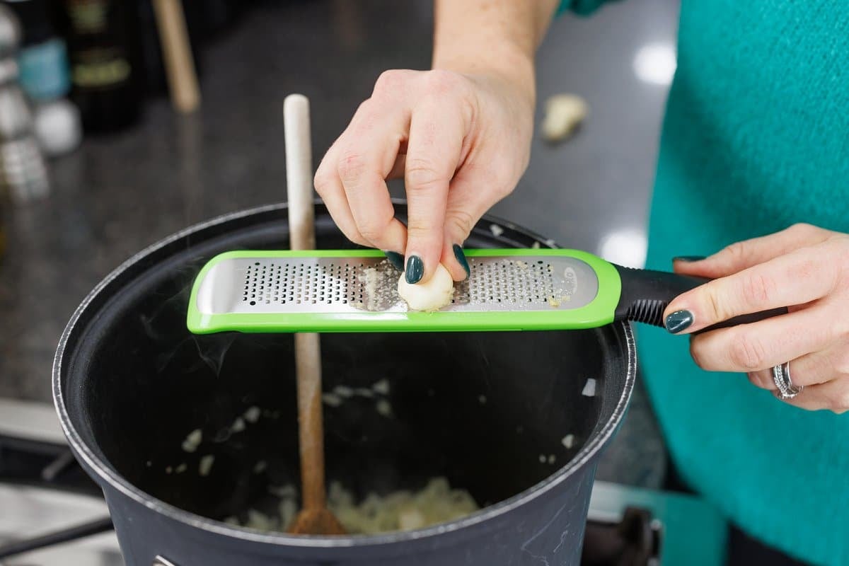 Then using a microplane, freshly grate in your garlic with the onion.