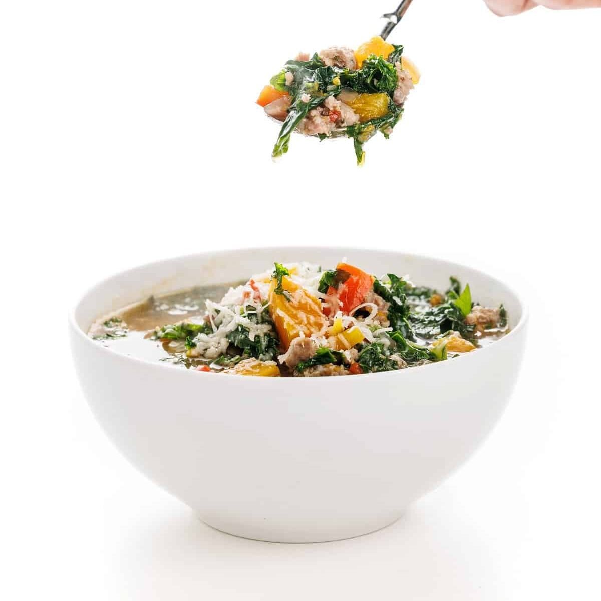 Spicy Italian sausage, hearty kale, and creamy butternut squash create a warm and satisfying soup that is perfect for freezing.