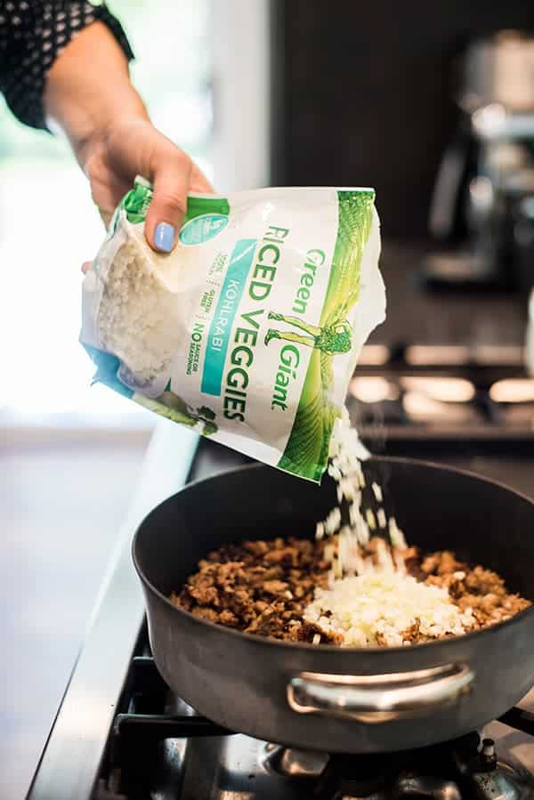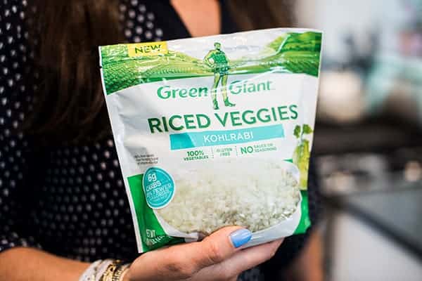 My secret? They are jam-packed with Green Giant Riced Veggies! Shh.. no one needs to know. While I normally love their cauliflower and veggie medley varieties, this time I was super excited to try one of their newest Riced Veggies: Kohlrabi! They also have three additional flavors that would work well in this recipe including Butternut Squash, Broccoli, and Beets.
