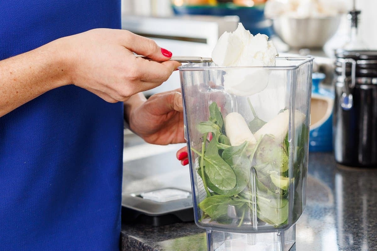 Start your shamrock shake by getting out your blender and adding the baby spinach.