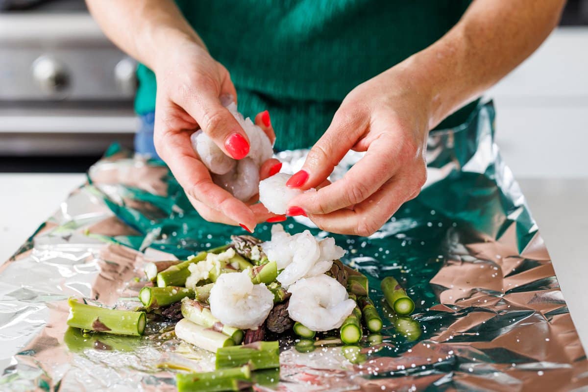 Next take your raw shrimp and place them evenly with the asparagus throughout the foil packet.