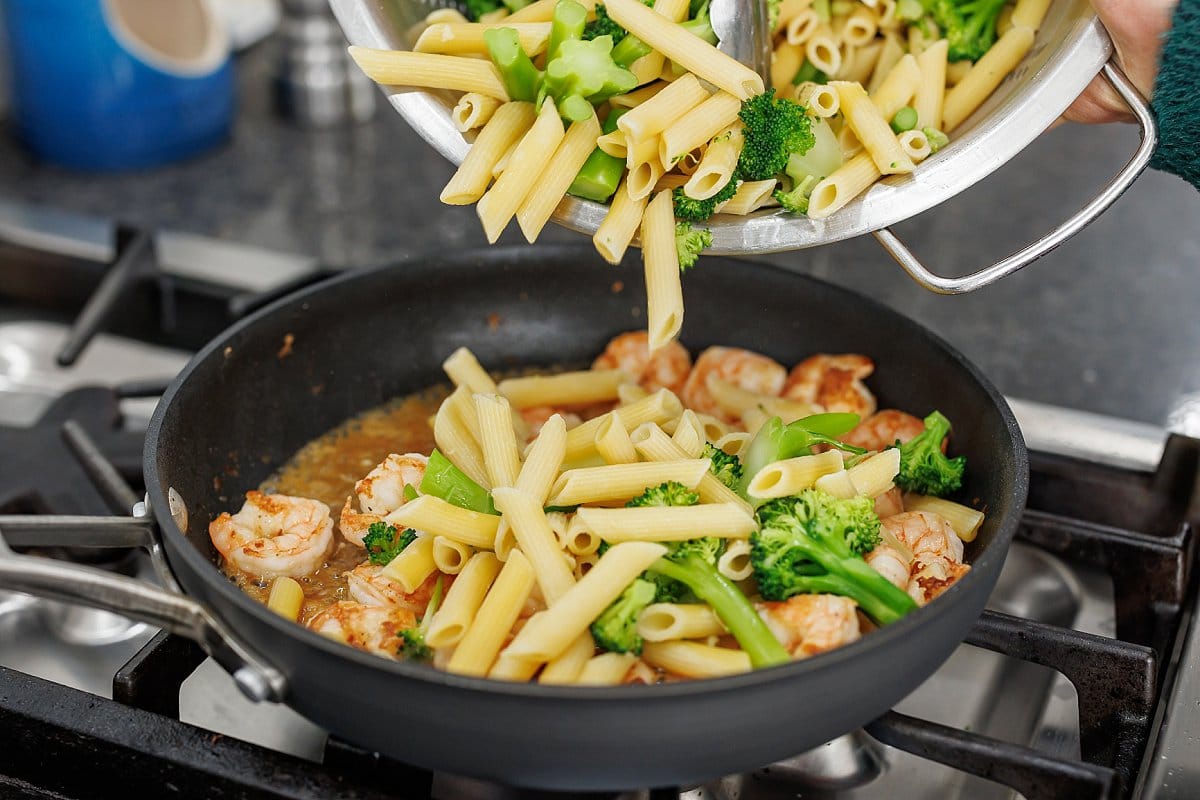 Once shrimp is cooked, add the reserved pasta and broccoli to the pan.