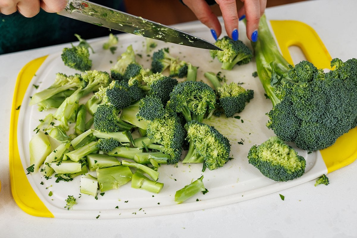 Start your shrimp and broccoli penne by washing and cutting your broccoli. You can use just the broccoli florets, but I love using the stalk as long as its cut into bite sized pieces.