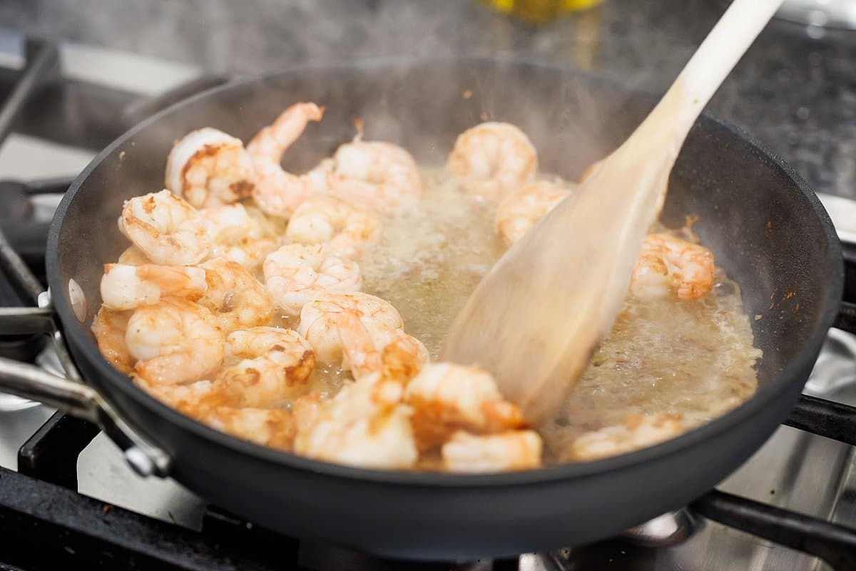 Then heat some olive oil in a pan and add the garlic, sautéing until aromatic, no more than 30 seconds. Add the shrimp and sauté until pink, about 3-4 minutes.