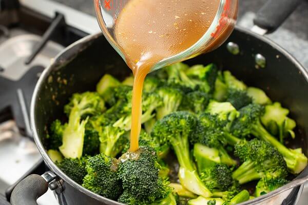 - Add chopped broccoli and chicken broth. Bring to a boil then cover with a tight lid to let steam for 3-4 minutes. In a small bowl, whisk soy sauce, rice wine vinegar, hoisin sauce, chili garlic paste, and sesame oil.