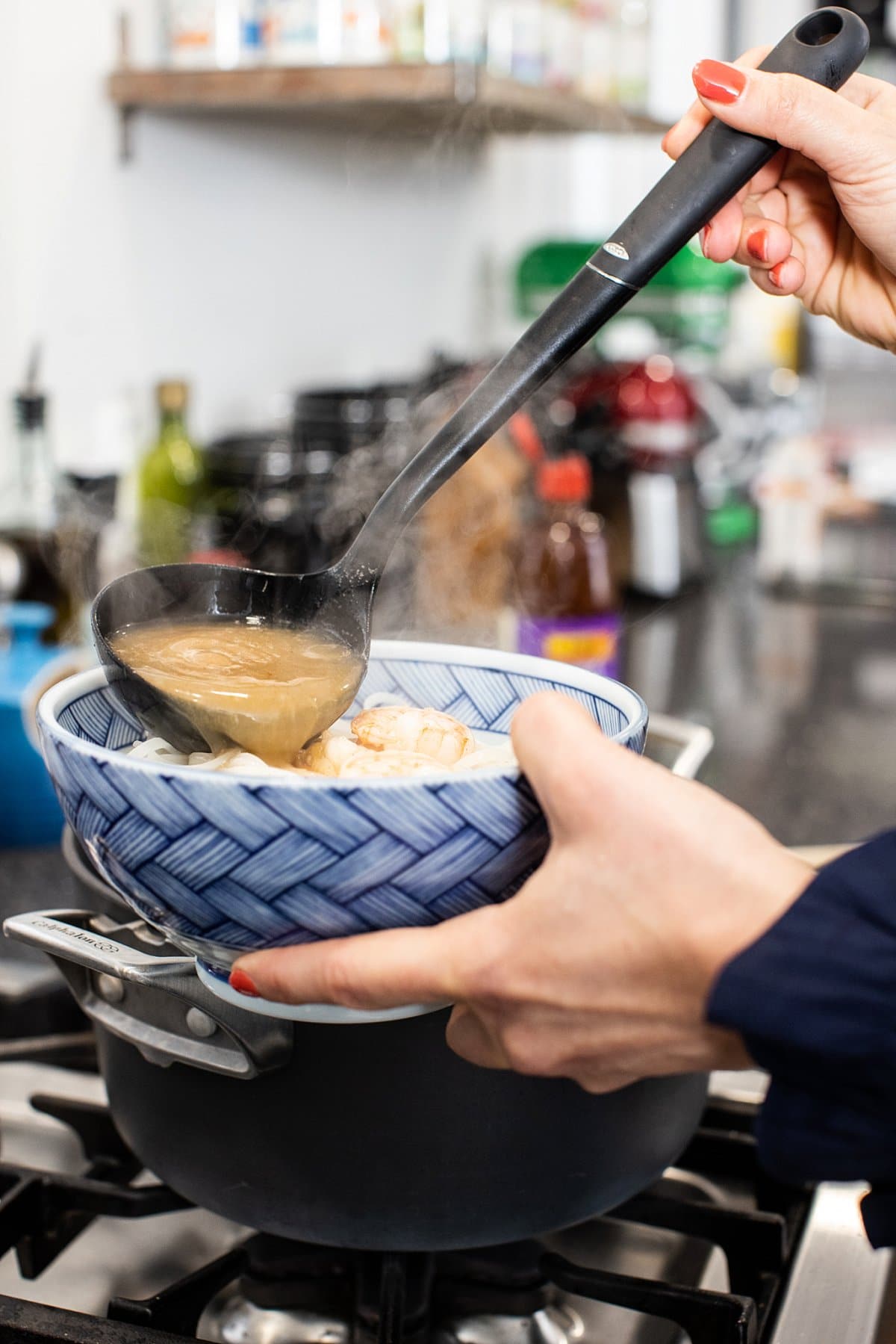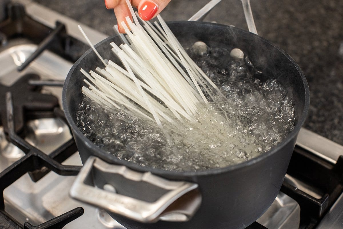 You can prepare the rice noodles according to package directions ahead of time or while the broth simmers.