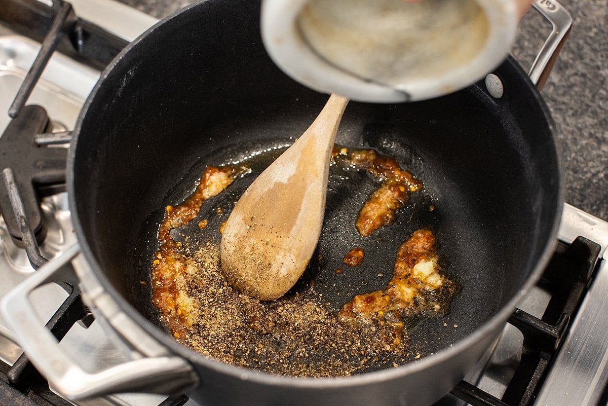 Saute chili garlic paste, spices, and ginger in sesame oil until fragrant.