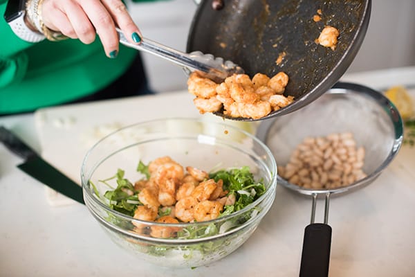 This fresh and flavorful arugula salad is topped with sautéed shrimp, sliced fennel and creamy white beans.