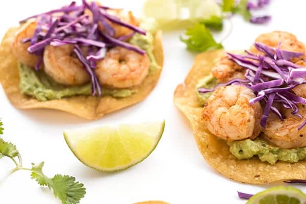 - Begin assembling tostadas by spreading each tortilla with two tablespoons guacamole. Top with 6 shrimp and optional garnishes (i.e. shredded cabbage, cilantro, etc.) Serve immediately.