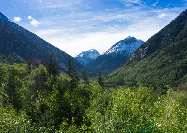 As you ascend higher and higher into the mountains, the landscape changes from lush green to snow-capped.