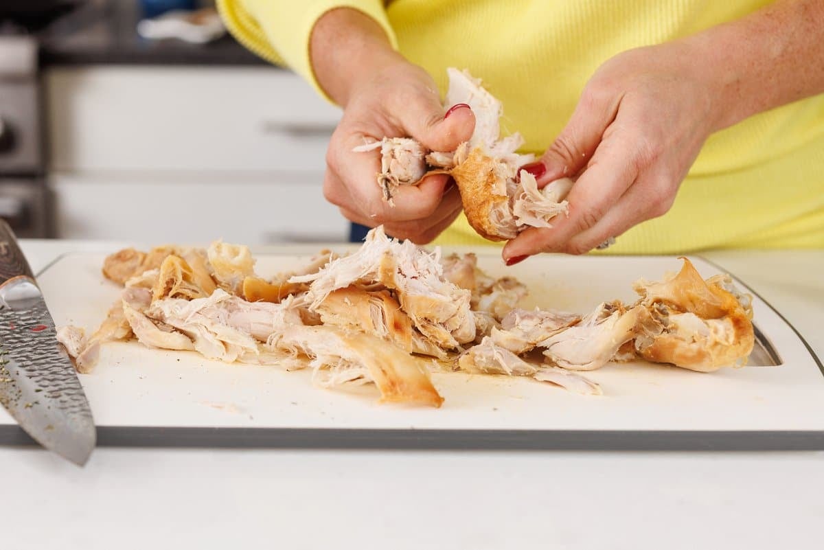 To save time, a hack of mine is I like to use leftover chicken or a rotisserie chicken, and shred that beforehand.