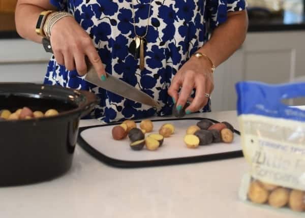 Instead of serving the chicken and peppers on a bun or over pasta, I decided to turn it into a one pot meal and tossed in halved white, purple and yellow potatoes from Little Potato Company. Velvety, creamy and packed with nutrients, my boys always devour them.
