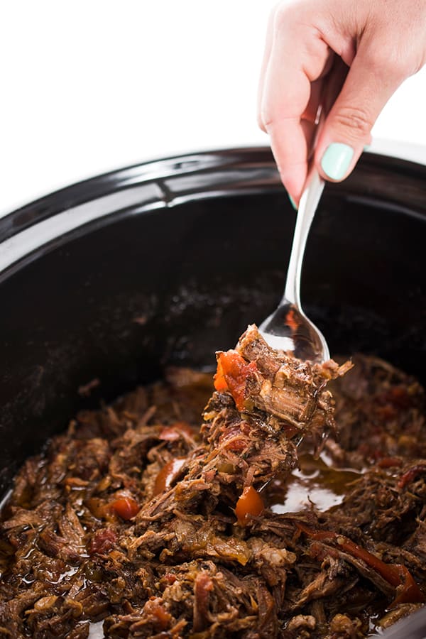 Ropa vieja, a traditional Cuban pulled beef recipe, is made in the slow cooker for convenience.