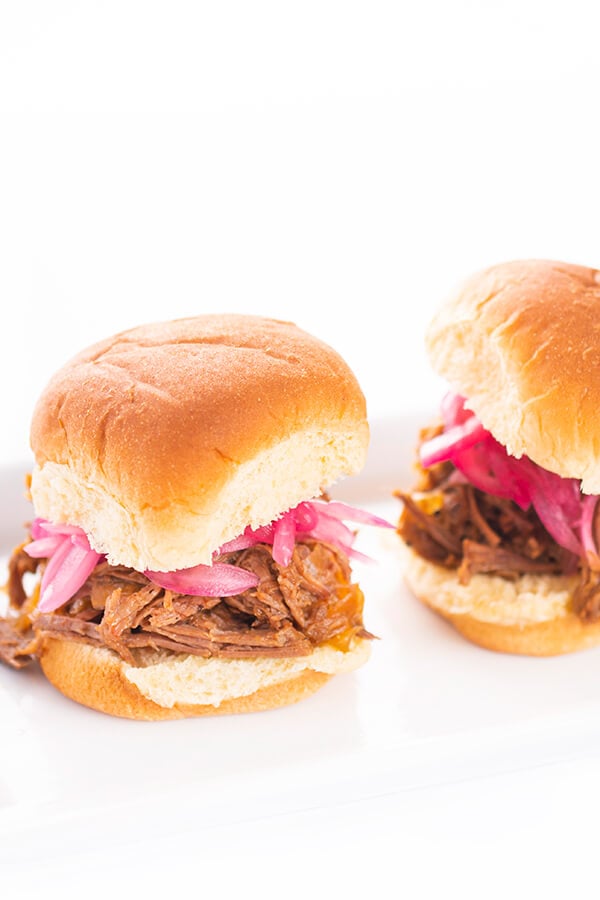 These sweet and smoky slow cooker shredded beef sliders are topped with tangy pickled red onions. The perfect recipe for entertaining a crowd!