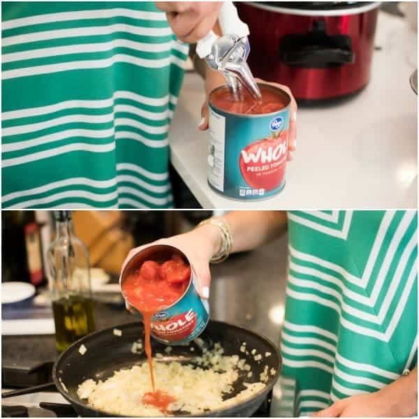 - While the onions are sautéing, use a pair of kitchen scissors to carefully cut the whole peeled tomatoes. Pour can into the pan along with the tomato sauce. Season with salt and pepper to taste. Bring sauce to a boil then remove from heat; set aside.