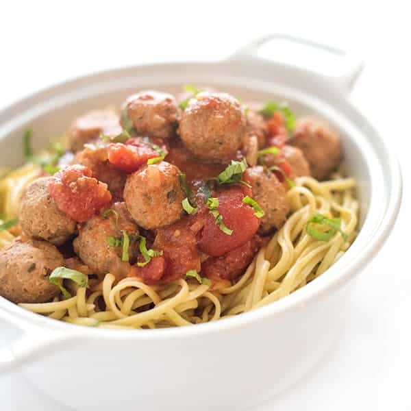 Turkey meatballs are slowly cooked in a homemade tomato basil marinara sauce until tender. Made without any breadcrumbs, this meatball recipe is gluten free.