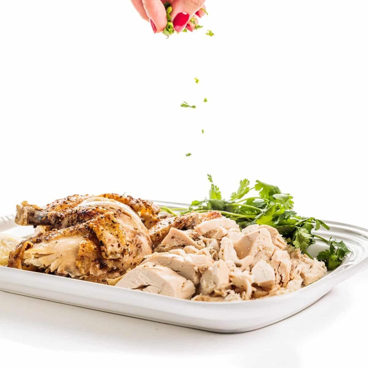 - This is optional but before serving, I recommend placing the chicken on a baking sheet and broiling until the skin is crispy, about 5-6 minutes. Serve sliced or shred up to use any way you wish.