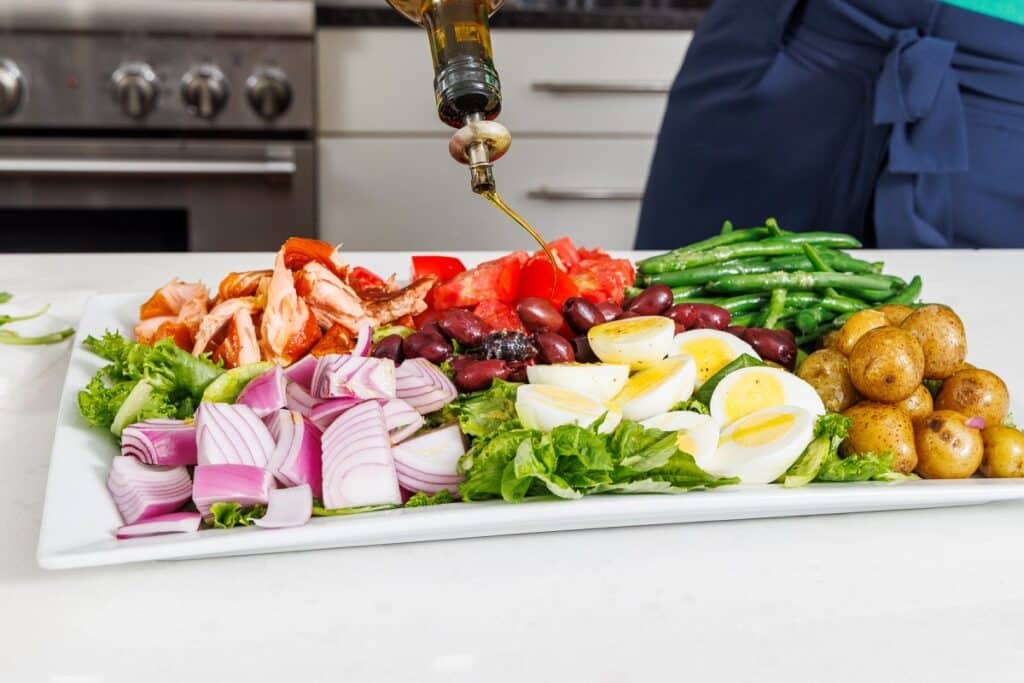 - Scatter arugula leaves on a large platter and top with prepared potatoes, flaked smoked salmon, eggs, tomato, red onion, kalamata olives and green beans.4 cups baby arugula, 4 large eggs, 1 cup cooked green beans, 1 large beefsteak tomato, 1/2 cup red onion, 24 kalamata olives, 8 ounces smoked salmon