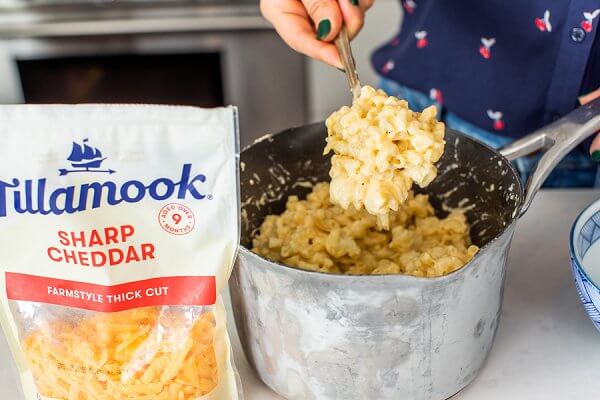 Remove from the heat then stir in the Tillamook shredded cheese. While I love using sharp cheddar, you can also use medium cheddar or even Colby jack.