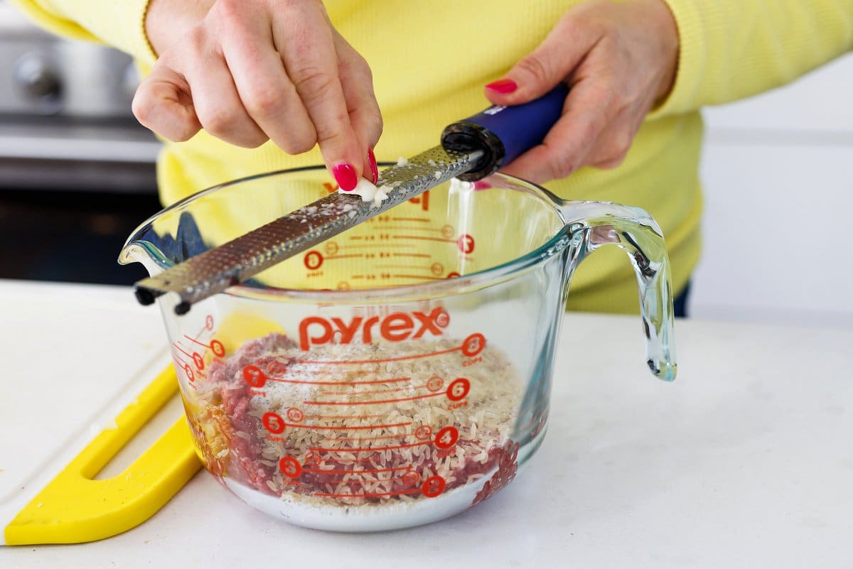 As there can never be enough garlic, using a microplane add garlic to the sauce.