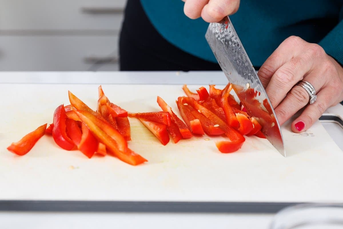 While shrimp is cooking, slice your bell peppers and basil.