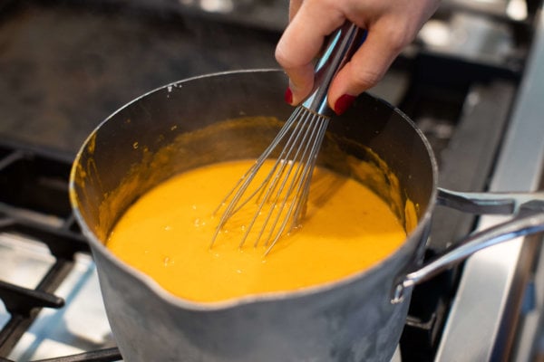 - Whisk in the coconut milk and pumpkin. Whisk until smooth. Pour in chicken broth and continue to whisk until smooth. Heat on high until it comes to a light boil then reduce to low. Simmer for 10 minutes. Season with salt and pepper to taste before serving.