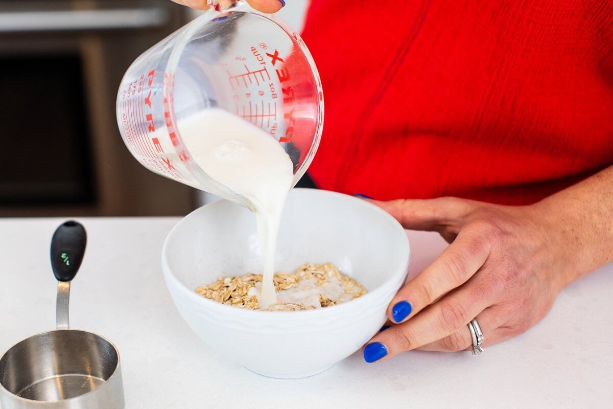 - Place the milk, oats, vanilla, salt and cinnamon in a microwaveable bowl and stir to combine.1/2 cup whole milk, 1/2 cup Old Fashioned Oats, 1 teaspoon vanilla, 1/4 teaspoon cinnamon, pinch salt