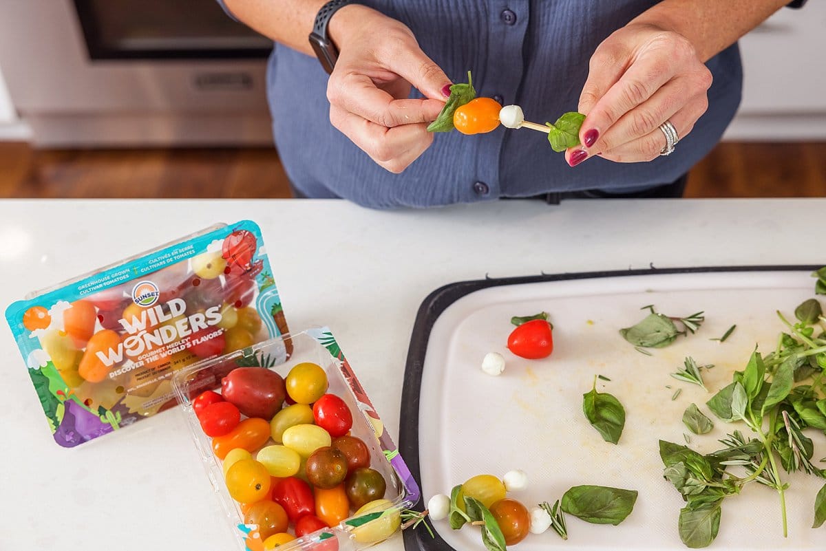 Next you’ll begin making your caprese skewers. Start with a Wild Wonders tomato, followed by a cheese ball, and a basil leaf.