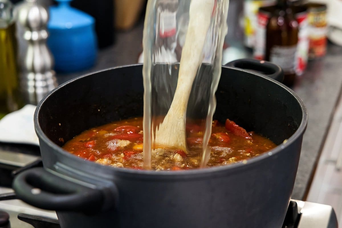 4. Add beer to deglaze, scraping up brown bits on bottom of pan using a wooden spoon.
