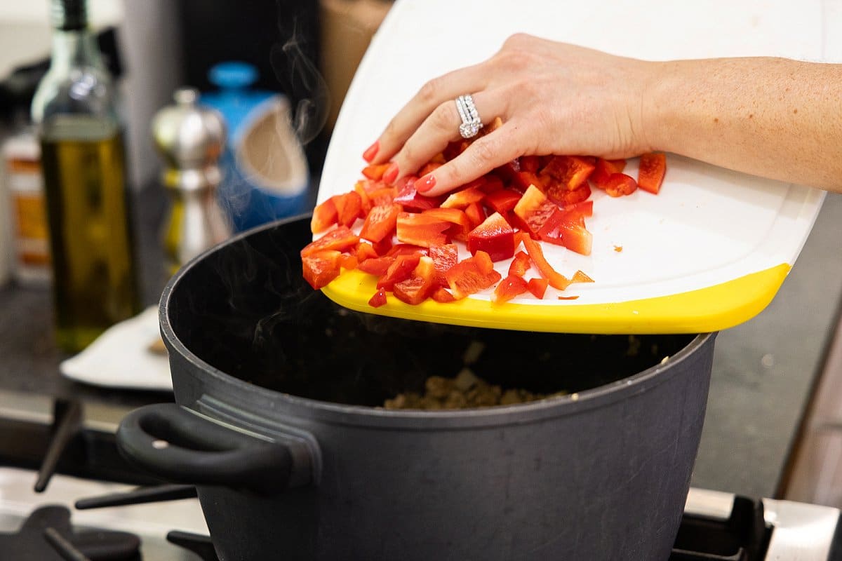Then add the chopped bell peppers and diced tomatoes to the pot. Cook until veggies are all soft.