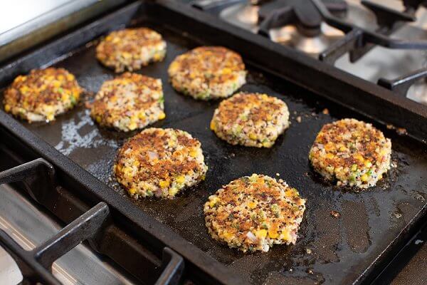 - Preheat griddle or a large skillet over medium-high heat. Spray with cooking spray or use a little oil. Cook patties for 5-6 minutes per side. Note: if they fall apart slightly simply push them back/re-shape into patties. Serve warm, room temperature or chilled.