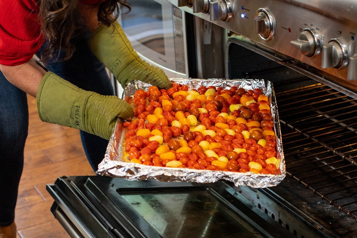 Tomatoes can be whole or halved – it doesn’t matter. Both work!