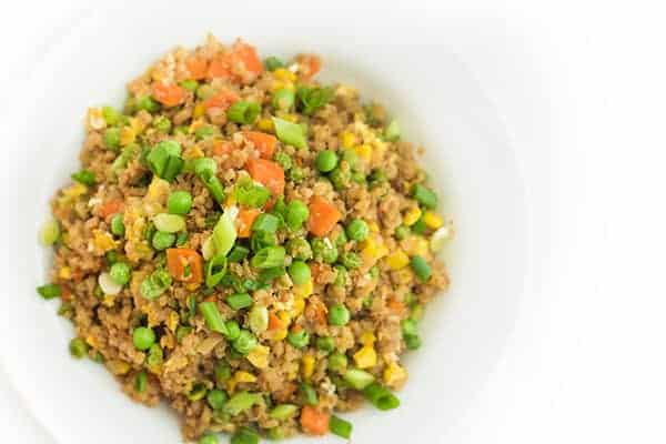 A healthy spin on the Chinese takeout classic, this vegetable fried rice is made with riced cauliflower then seasoned toasted sesame oil and fragrant ginger.