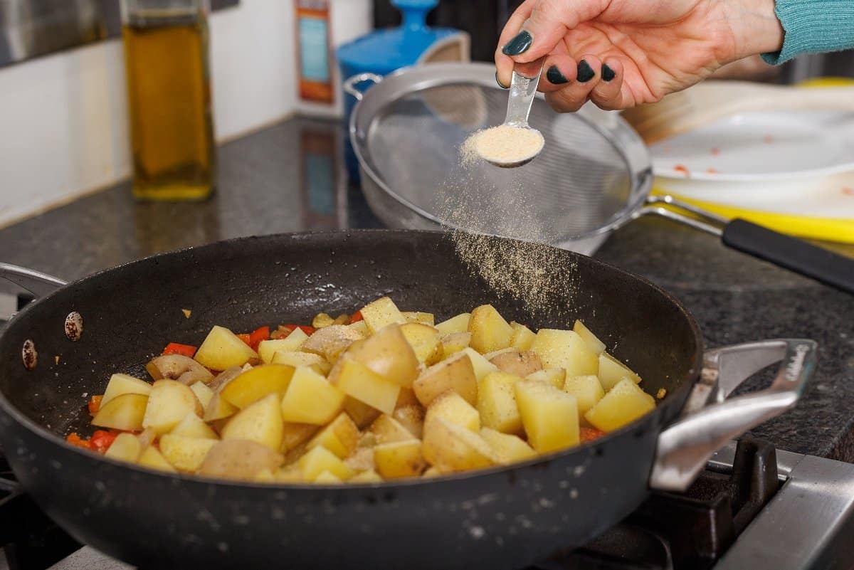 - Add diced peppers to the pan and continue sautéing until tender, about 4-5 minutes. Pour in par-boiled potatoes that have been drained and patted dry. Sprinkle with garlic powder, seasoned salt and cayenne. Continue sautéing until onions are almost caramelized, peppers are tender and potatoes are browned.1 red bell pepper, 1 teaspoon garlic powder, 1 teaspoon seasoned salt, 1/2 teaspoon cayenne