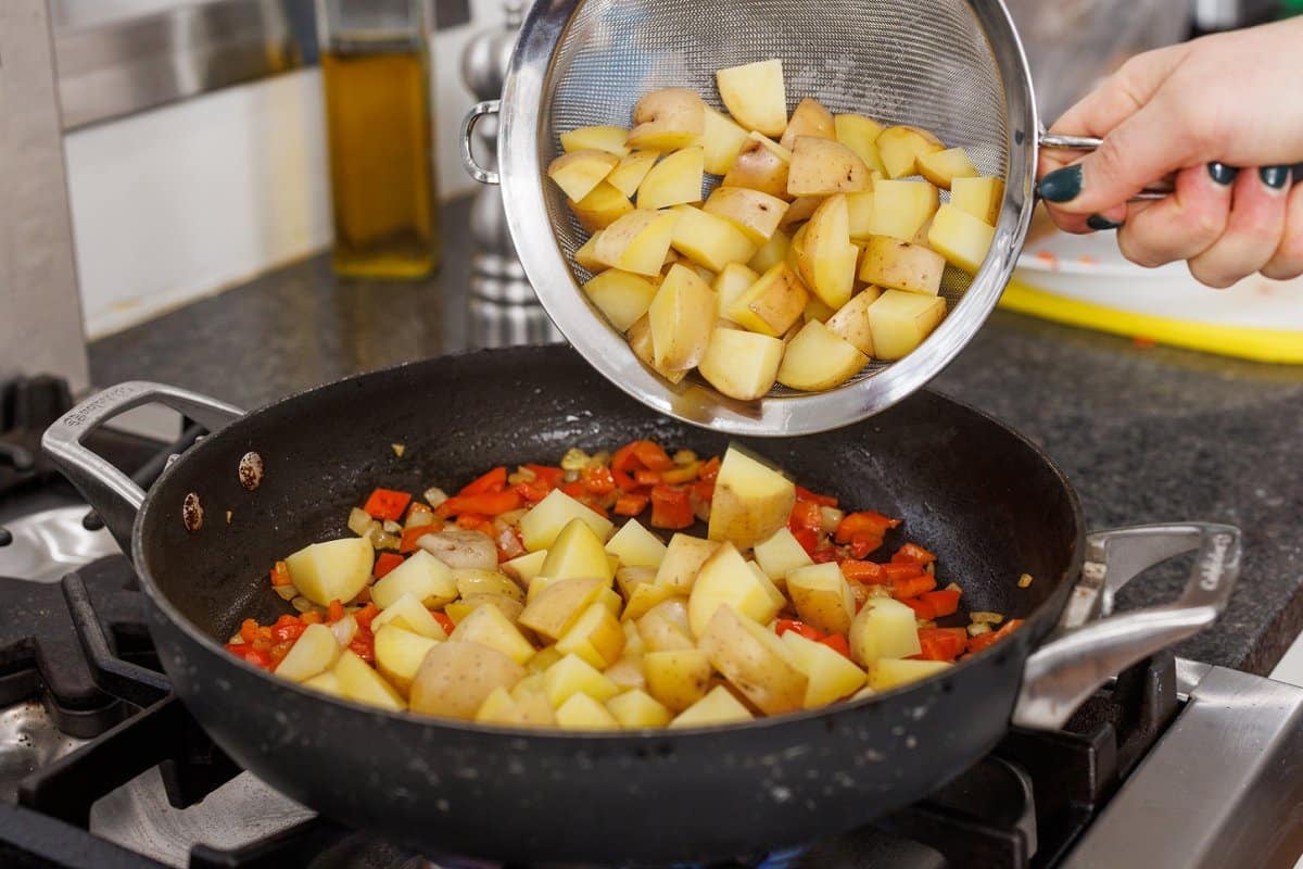 Start your vegetable hash breakfast skillet by chopping and par-boiling your potatoes.