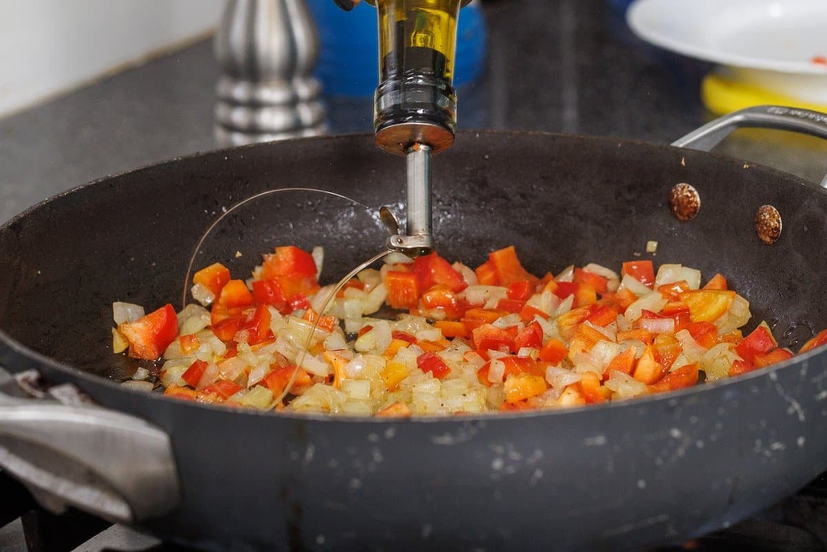 After the onion has cooked for a couple minutes, add the red pepper and continue to sauté.
