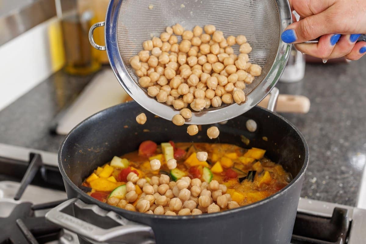 Finish by adding in the strained and rinsed chickpeas. Bring pot to a boil, then cover with a lid and reduce heat to a simmer. Let cook on low heat for about 45 minutes, until vegetables are tender.