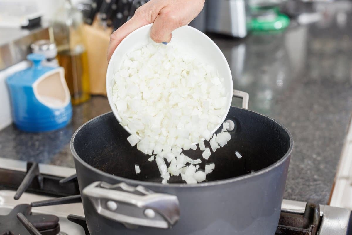 - In a large stock pot, heat oil over medium heat then add onions, garlic and ginger plus a sprinkle salt and pepper. Cook until onions start to become translucent, about 7-9 minutes, stirring frequently.