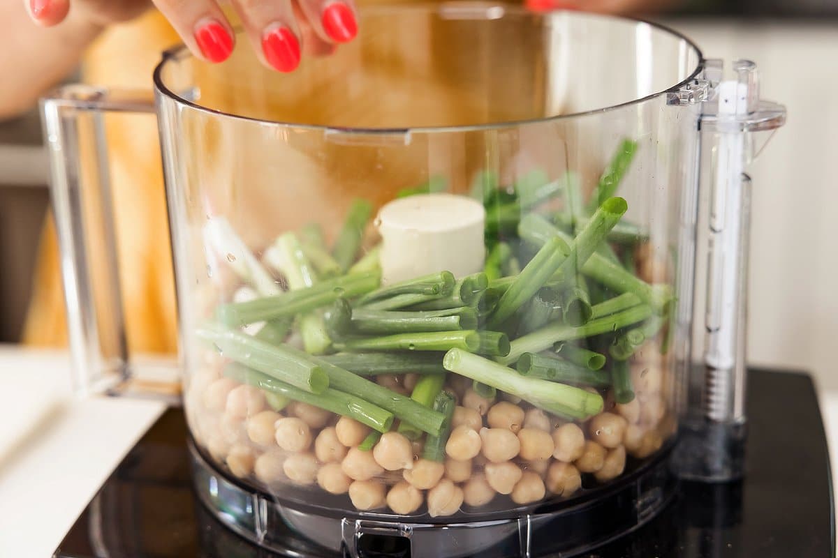 First, place canned chickpeas (be sure to drain and rinse), lemon juice and scallions in a high-speed food processor. Chickpeas are super high in protein and work as an excellent meat replacement in vegetarian recipes.