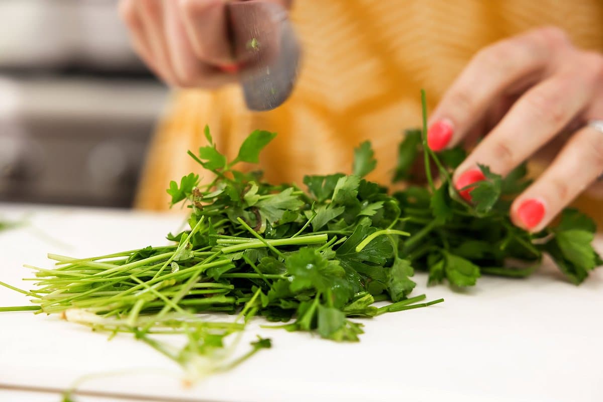 Second, chop the parsley. Bunch the leaves together, remove the stems and rock-chop the parsley with an up and down motion. You do this by keeping the blade still while you push the leaves forward.