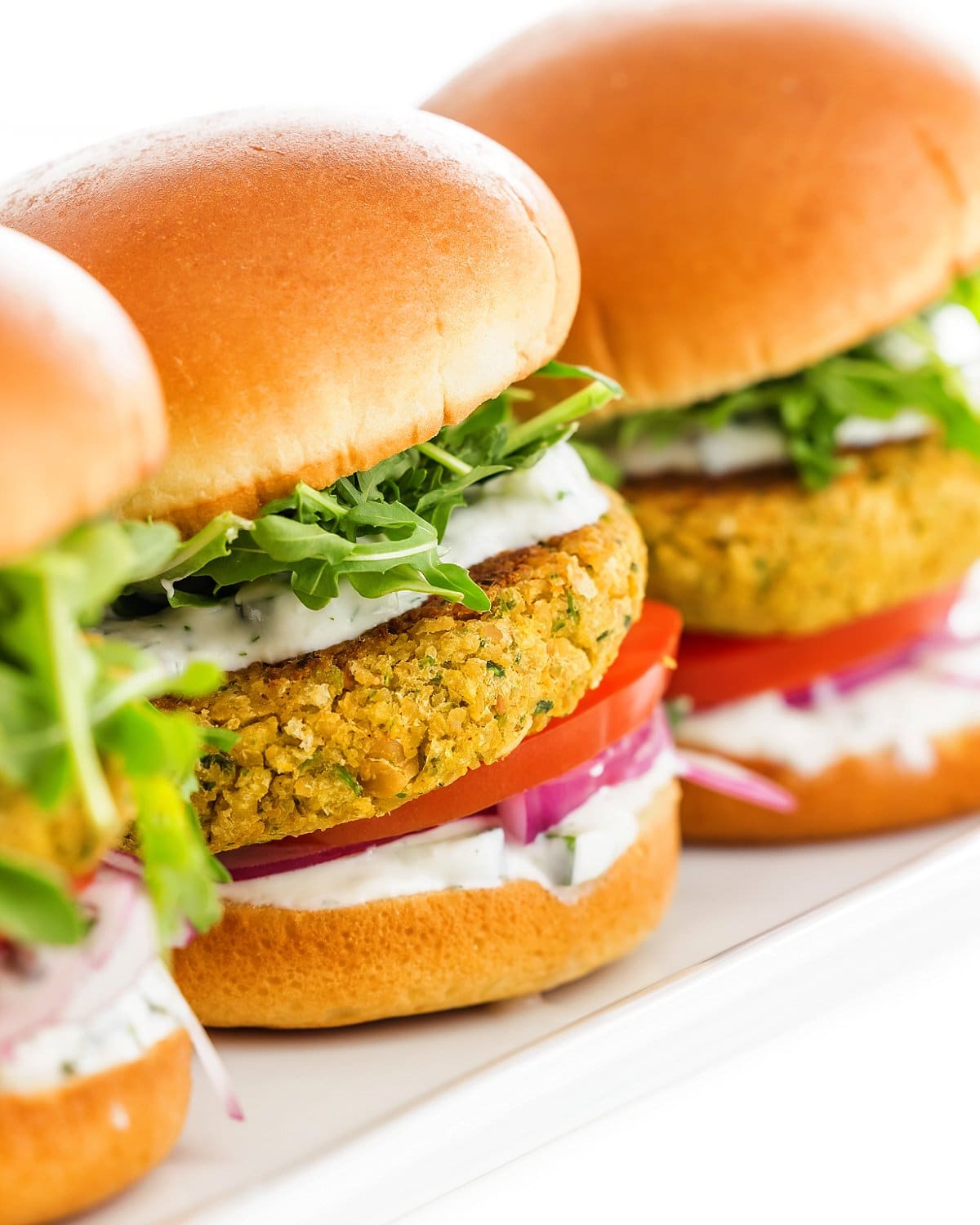 These vegetarian Middle Eastern chickpea burgers are made with fresh herbs and topped with Tzatziki, a creamy cucumber-dill yogurt sauce.