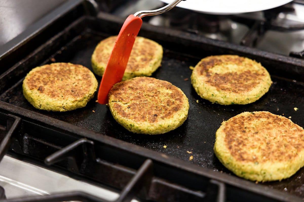 Lastly, it’s time to cook the patties. Heat a non-stick griddle or frying pan over medium-high heat and brown the patties until they are golden brown. This takes about 4-5 minutes per side.