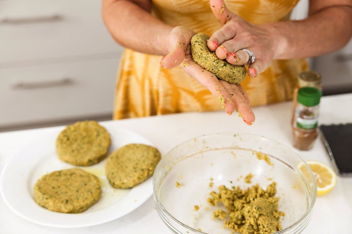 To make this process easier, divide the bowl mixture into quarters with your hands to create four patties. This is one of my favorite parts of the process — it’s fun and therapeutic!