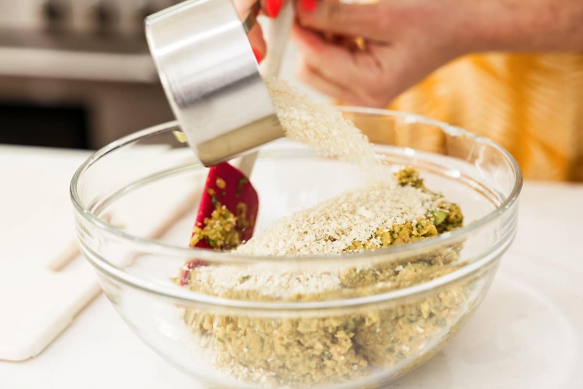 Then, remove the mixture from the food processor and place it into a medium bowl. Slowly stir in the breadcrumbs a few tablespoons at a time.