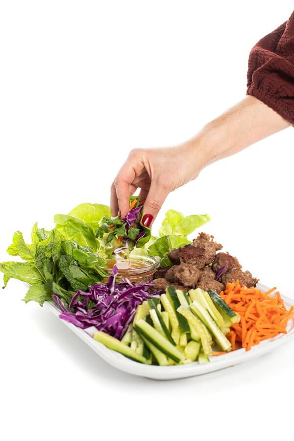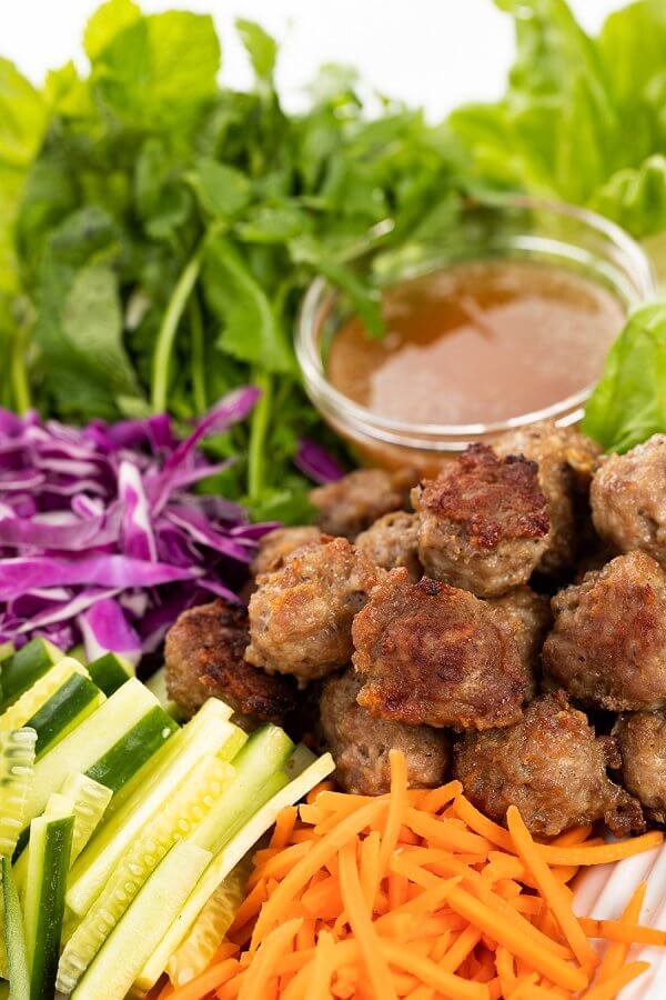 These light and flavorful Vietnamese lettuce wraps are filled with BBQ pork meatballs, crunchy vegetables and fresh herbs.